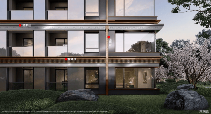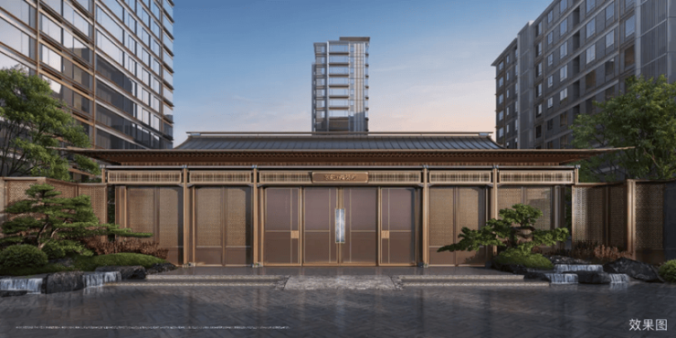 京能西贤府将全球审美与东方雅韵相融,遵循北宋建筑北高南低布局,开创性采用全景玻璃幕墙建筑立面,建筑楼体顶部采用宋式回形纹飞檐设计,楼身竖向古铜色铝板与大面玻璃形成对比明晰,构成简约现代的无界寰幕格局。