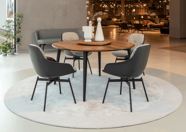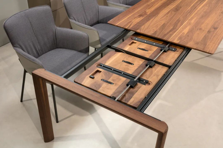 RolfBenz957 由 SchneiderDesign 设计,形式与功能并重:餐桌的延伸功能采用隐藏式设计。台脚曲线如丝带般流畅优雅,匠心木艺展现优质轮廓。