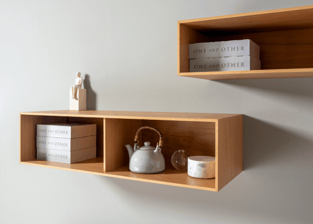 隔板还提供多种宽度选择,配以现代风格的底座支脚固定于墙面,或是配以铸铁支脚,用隔断划分出内外抽屉。开放式柜体可固定在墙面,可以横向布置或垂直布置,也可以对墙体进行大面积地覆盖。