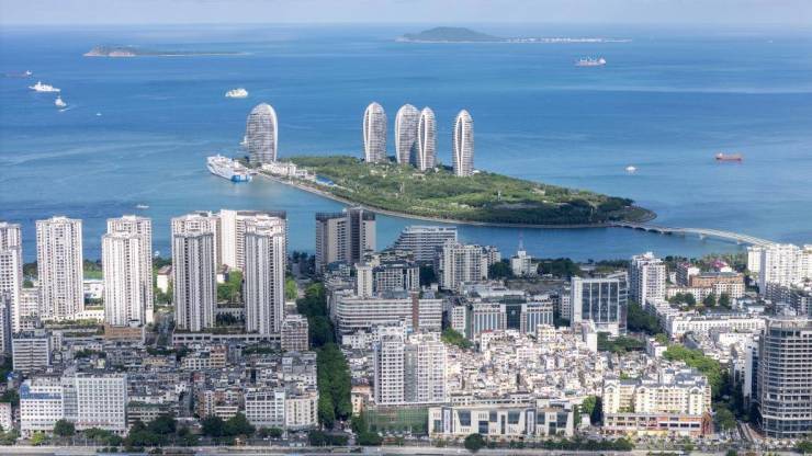 海南省三亚市,航拍三亚市区和凤凰岛。