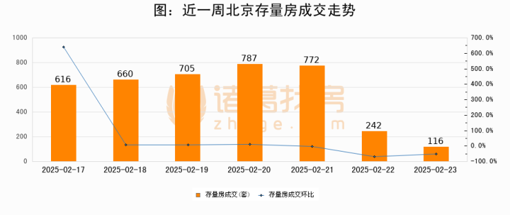 从存量房来看,2025年02月23日北京存量房单日成交116套,比昨日减少126套,环比下降52.1%。从近一周存量房成交来看,北京存量房日均成交套数为556套,02月23日单日成交116套,低于近一周平均水平79.1%。