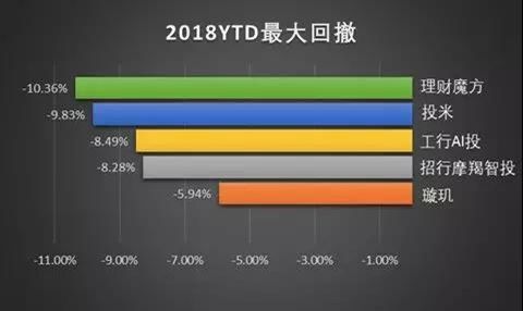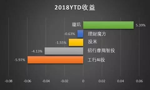 《2018上半年中美智能投顾产品表现测评》报告,研究了国内五家智能投顾服务商产品,它们分别是招行摩羯智投、工行AI投、第三方财富宜信投米RA、理财魔方、璇玑(to B为主)在2017/12/31-2018/8/19期间的表现。