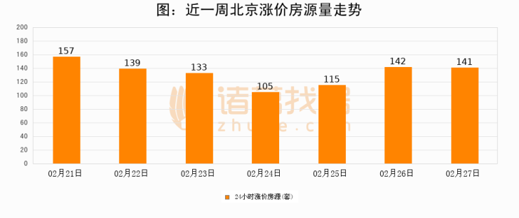根据诸葛找房数据显示,北京24小时涨价房源量为141套,较02月26日减少1套,环比下降0.7%。与此同时,涨价房源占比小幅回落,对于购房者来说是一个入市窗口期,购房者可抓住时机入市。