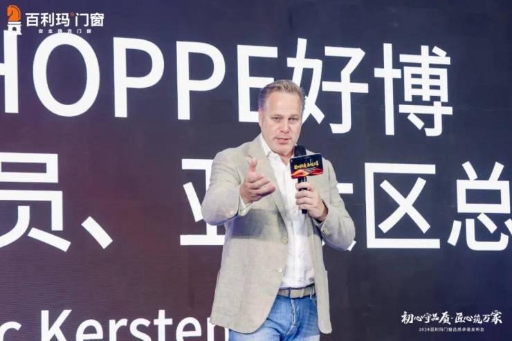 德国HOPPE好博董事会成员、亚太区总裁 Eric Kersten发言表示,好博与百利玛门窗超十年的合作,源于双方相互契合的高品质产品理念,期待下一个十年双方能够并驾齐驱,共创辉煌,共同推动门窗产业高质量发展。