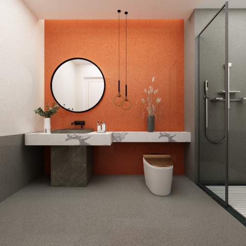 您家的洗手间装潢有我家漂亮吗?选用人造石桑巴红系列产品,鲜艳热烈的色彩,均匀细致的花纹,一如桑巴舞般火热动人。桑巴红搭配洗手台那流水般的云状纹路,加上气质高贵的座便器,整个空间高端、大气、上档次,一看就是富贵人家的洗手间。