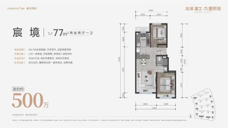建筑面积约77㎡奢妆两居,南北通透,拥有南向连续双面宽、约6.5m全景飘窗采光视野, LDK一体化设计实现空间延伸。面积虽小,但尺度丝毫不缺豪宅范。