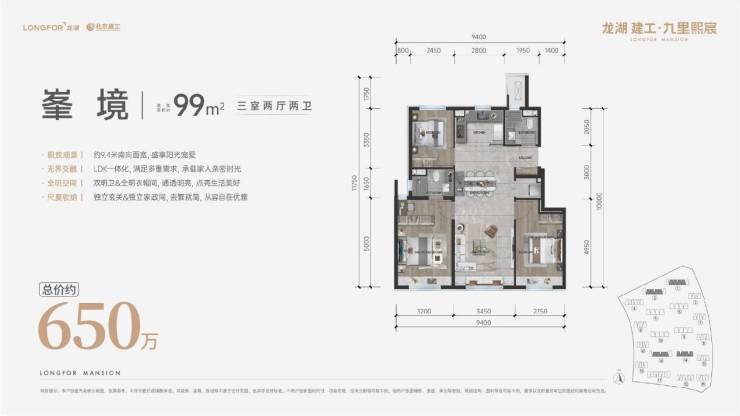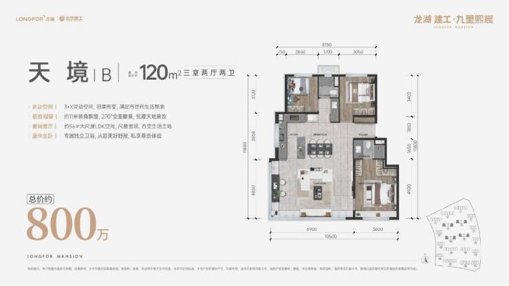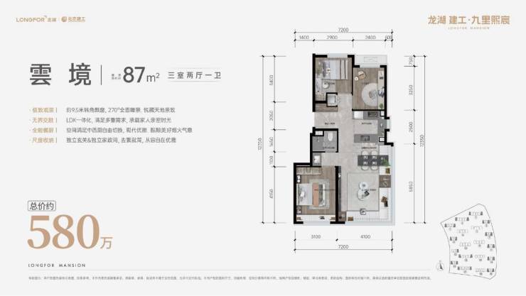 建筑面积约87㎡奢适三居,超9米270°转角飘窗,打破空间及视野界限,真正达到了越级体验;约22㎡LDK餐客厨一体化设计、可分可合中西厨,日常起居、烹饪、用餐,优享超阔空间体验。