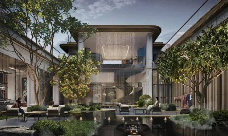 下沉庭院+镜池浮岛,近千平会所环抱垂瀑,把宋庄艺术DNA刻进社区肌理。