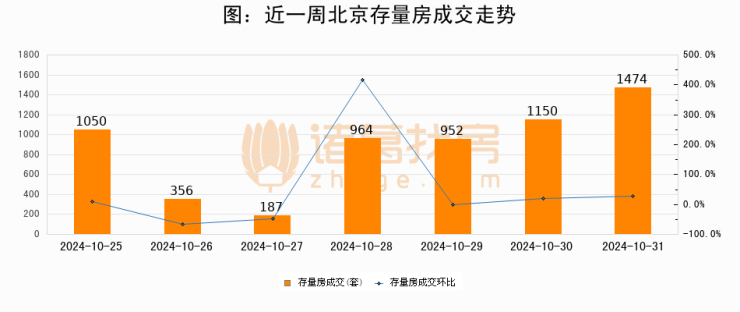 从存量房来看,2024年10月31日北京存量房单日成交1474套,比昨日增加324套,环比上涨28.2%。从近一周存量房成交来看,北京存量房日均成交套数为876套,10月31日单日成交1474套,高于近一周平均水平68.3%。