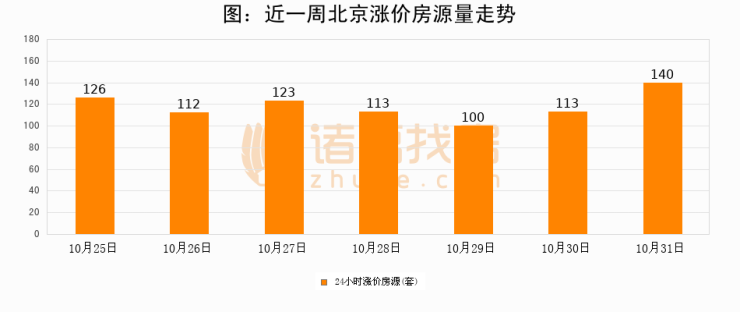 根据诸葛找房数据显示,北京24小时涨价房源量为140套,较10月30日增加27套,环比上涨23.9%。与此同时,涨价房源占比小幅扩大,业主信心有所提升。