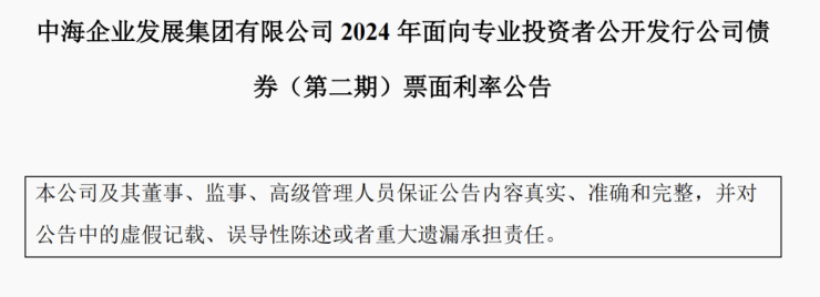 【环球网房产报道】11月26日,中海企业发展集团有限公司发布2024年面向专业投资者公开发行公司债券(第二期)票面利率公告。