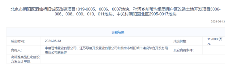 根据成交结果,该地块由中建智地置业有限公司、江苏绿建开发置业有限公司和北京市朝阳城市建设综合开发有限责任公司组成的联合体以底价112亿元摘得。