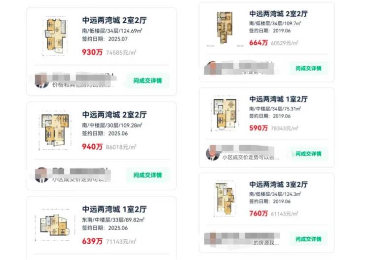 每经记者查询发现,市区内环内部分次新小区价格相对抗跌,如中远两湾城2房2厅户型,近期成交单价在75000元~86000元/平方米。