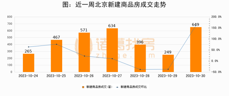 根据北京市住房和城乡建设委员会数据显示,2023年10月30日北京新建商品房成交649套,较昨日增加400套,环比上涨160.6%