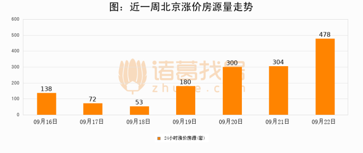 根据诸葛找房数据显示,北京24小时涨价房源量为478套,较09月21日增加174套,环比上涨57.2%。与此同时,涨价房源占比小幅扩大,业主信心有所提升。