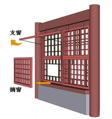 根据窗扇开启方式,又有支摘窗、推窗、吊搭窗、槅扇窗等;