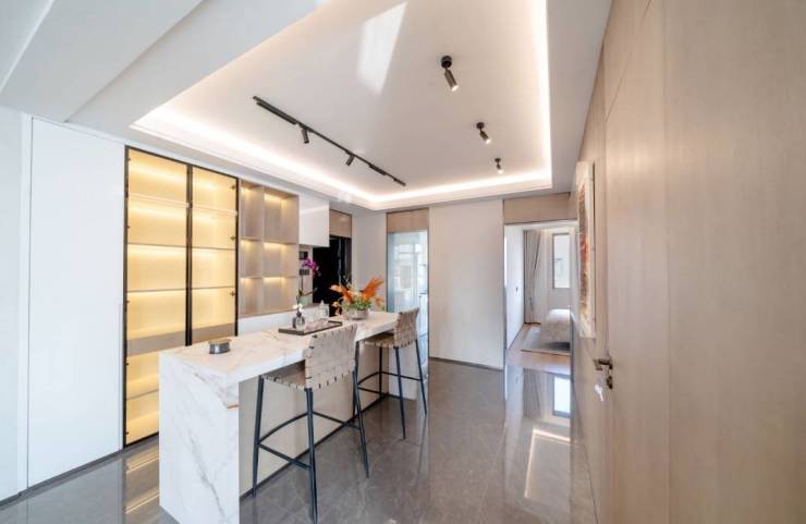 餐厅、厨房、客厅成一字式布排,完美复刻日常生活起居动线,真正地从细节把握每一处居住体验。现货天花板不容错过!