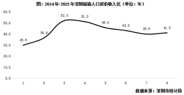 2021年,克而瑞研究中心依深圳统计局数据计算得出,深圳城镇人口房价收入比在2016年达到顶峰,为52.0,到2020年降到39.9,2021年数据为41.0。
