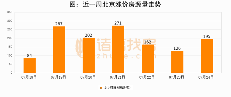 根据诸葛找房数据显示,北京24小时涨价房源量为195套,较07月23日增加69套,环比上涨54.8%。与此同时,涨价房源占比小幅扩大,业主信心有所提升。
