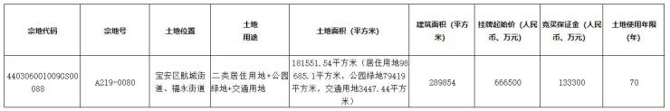 地块出让公告显示,此次出让宗地为A219-0080号地块,地块位于宝安区航城街道、福永街道,为二类居住用地、公园绿地及交通用地,土地面积181551.54平方米(其中,居住用地98685.1平方米),地块建筑面积289854平方米,挂牌起始价66.65亿元。