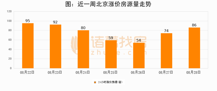 根据诸葛找房数据显示,北京24小时涨价房源量为86套,较08月27日增加12套,环比上涨16.2%。与此同时,涨价房源占比小幅扩大,业主信心有所提升。