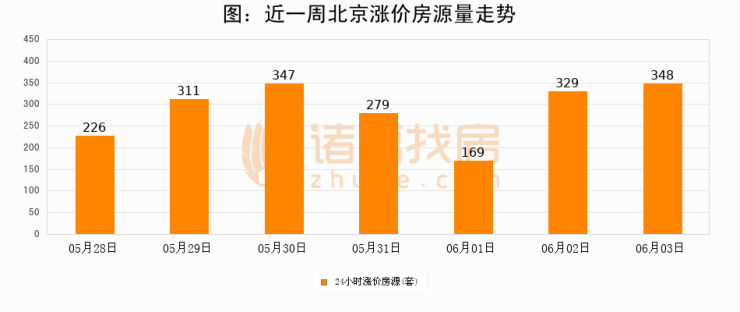 根据诸葛找房数据显示,北京24小时涨价房源量为348套,较06月02日增加19套,环比上涨5.8%。与此同时,涨价房源占比小幅扩大,业主信心有所提升。
