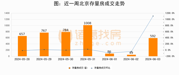 从存量房来看,2024年06月03日北京存量房单日成交592套,比昨日增加543套,环比上涨1108.2%。从近一周存量房成交来看,北京存量房日均成交套数为563套,06月03日单日成交592套,高于近一周平均水平5.2%。