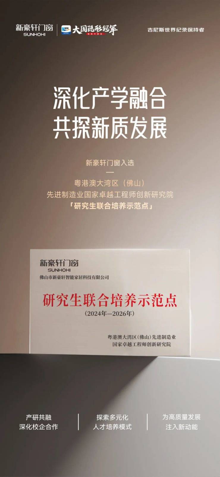 作为粤港澳大湾区(佛山)先进制造业国家卓越工程师创新研究院的“研究生联合培养示范点”,新豪轩门窗积极探索校企协作的新模式与新路径,促进创意设计成果转化,赋能产业高质量发展。