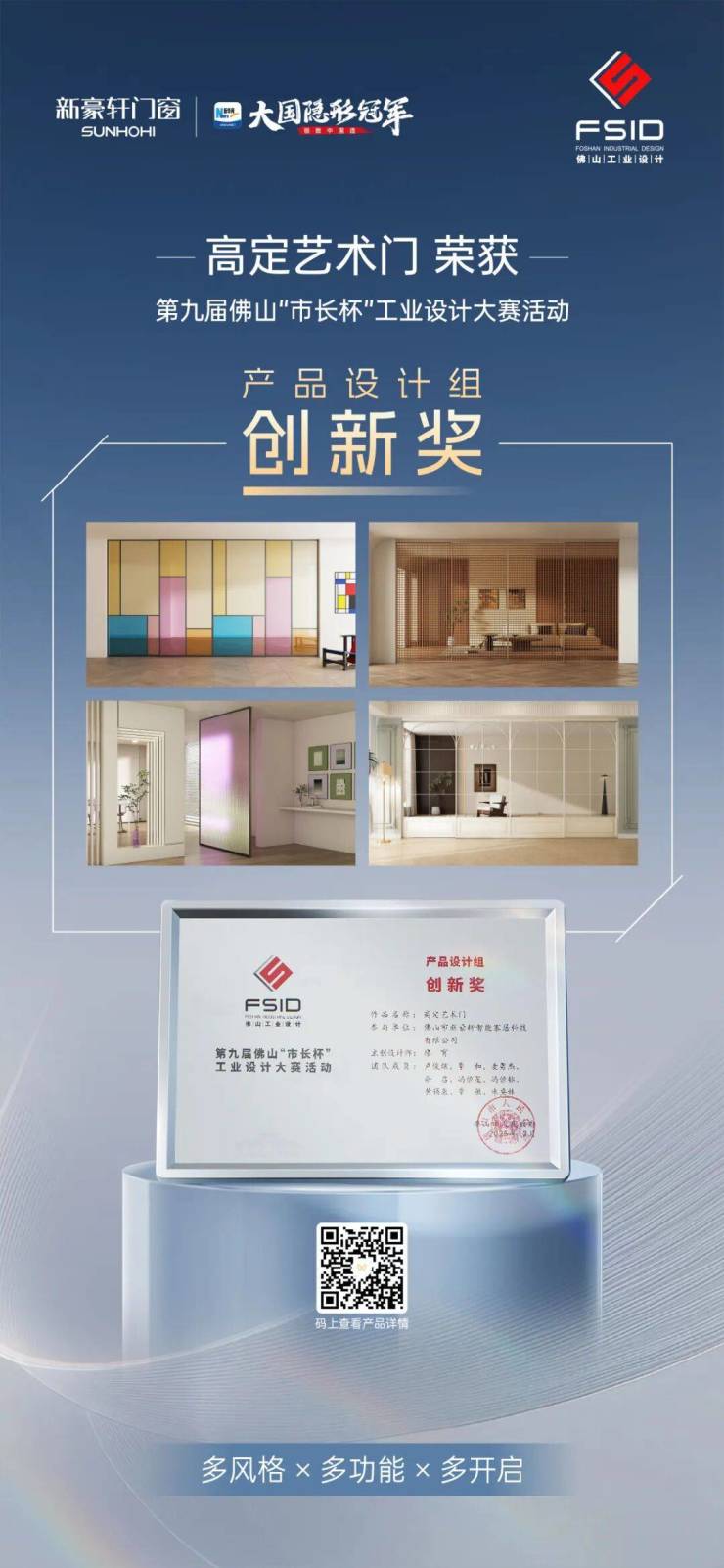 活动现场,备受瞩目的第九届佛山“市长杯”颁奖仪式同步举行,汇聚了众多设计精英之作,以创新设计语言,演绎新高定美学。新豪轩高定艺术门凭借其卓越的设计和创新理念,斩获第九届佛山“市长杯”工业设计大赛活动产品设计组创新奖。继2022年后,新豪轩门窗再度获奖,成为行业首个两度获此殊荣的门窗品牌。