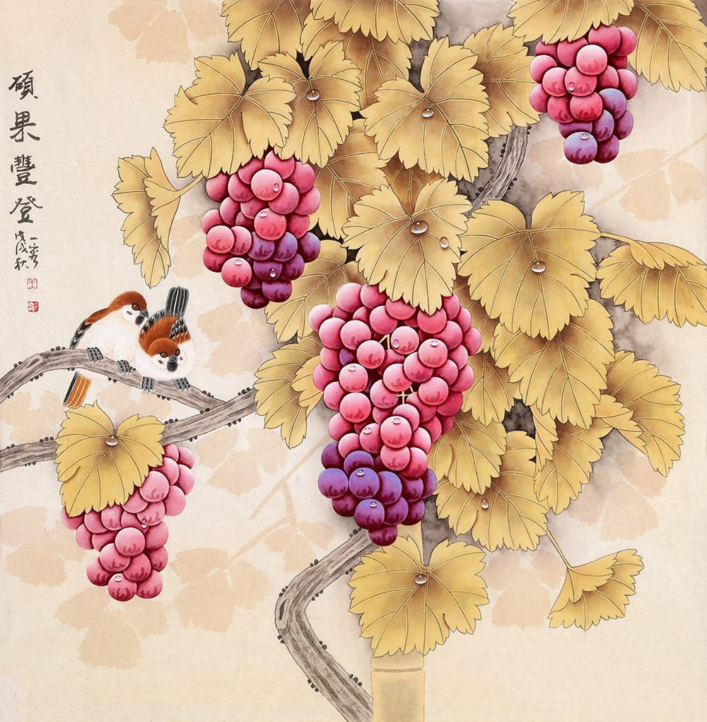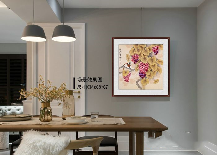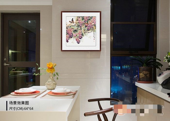 我们细看这幅葡萄图,王一容老师被誉为当代工笔重彩传人,她笔下的葡萄晶莹剔透,饱满圆润看着仿佛就要流口水了。构图中又增加了两只俏皮的雀鸟,更是给整个画面增添了许多的生机。这样一幅葡萄图挂在餐厅里不仅仅寓意好,还能够彰显品位,营造艺术氛围。