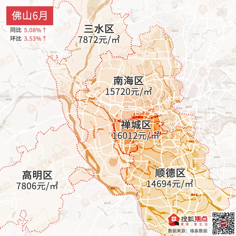 佛山6月均价为13754 元/㎡同比上涨5.08%↑,环比上涨3.53%↑