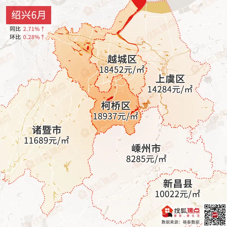 绍兴6月均价为13333元/㎡同比上涨2.71%↑,环比上涨0.28%↑