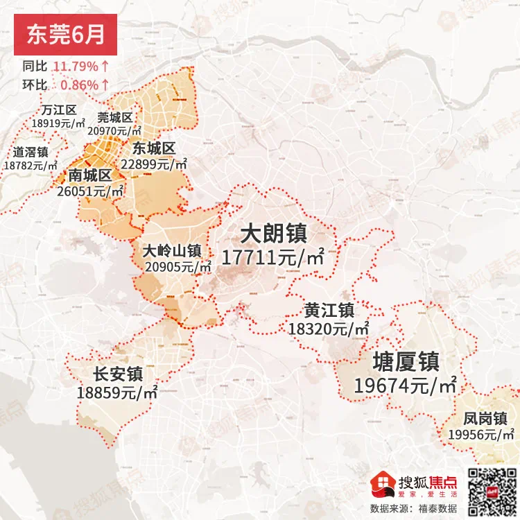东莞6月均价为17921 元/㎡同比上涨11.79%↑,环比上涨0.86%↑