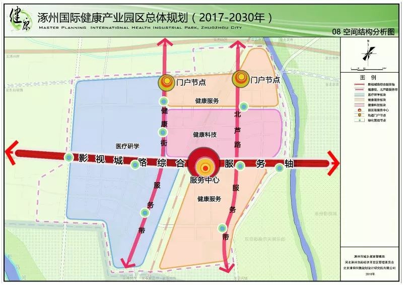 一轴两带:园区中部形成影视城路综合服务轴线,沿健康街与北芦路形成两条纵向服务带。