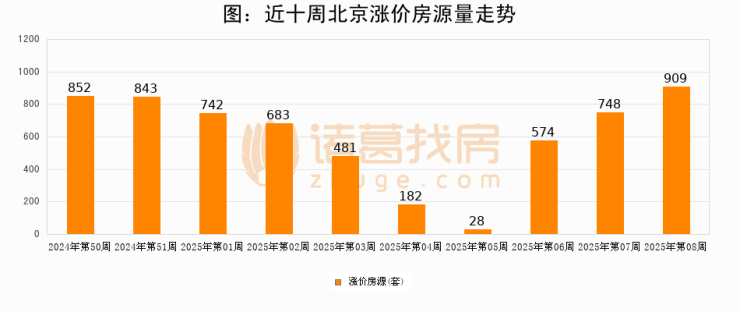 从调价房源来看,第8周北京涨价房源909套,较上周上涨21.5%。与此同时,8周涨价房源占比提升0.19个百分点,业主信心持续恢复。