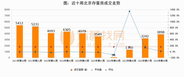 存量房方面,第08周北京存量房成交3898套,较上周增加656套,环比上涨20.2%。从近十周成交走势来看,周均成交套数为3526套,本周高于平均水平10.6%。