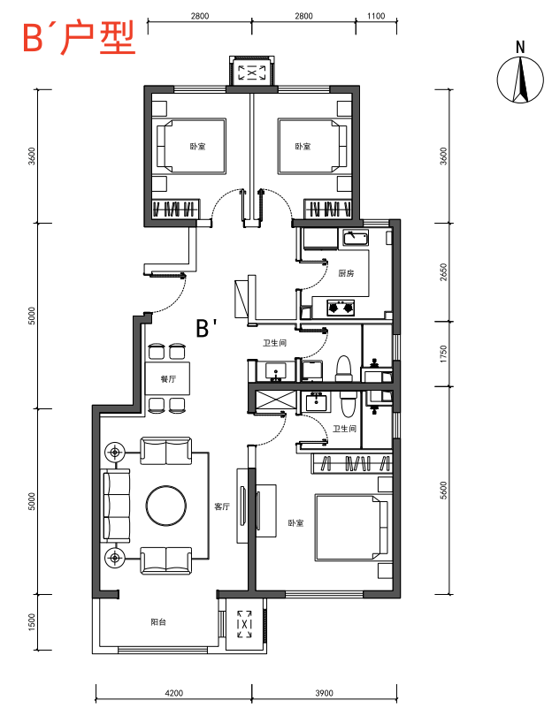 再来看119平三居,B户型和B´户型的区别是,B户型的两个卫生间是暗卫,B´户型的两个卫生间是明卫,其余格局都一样,所以优选B´户型。