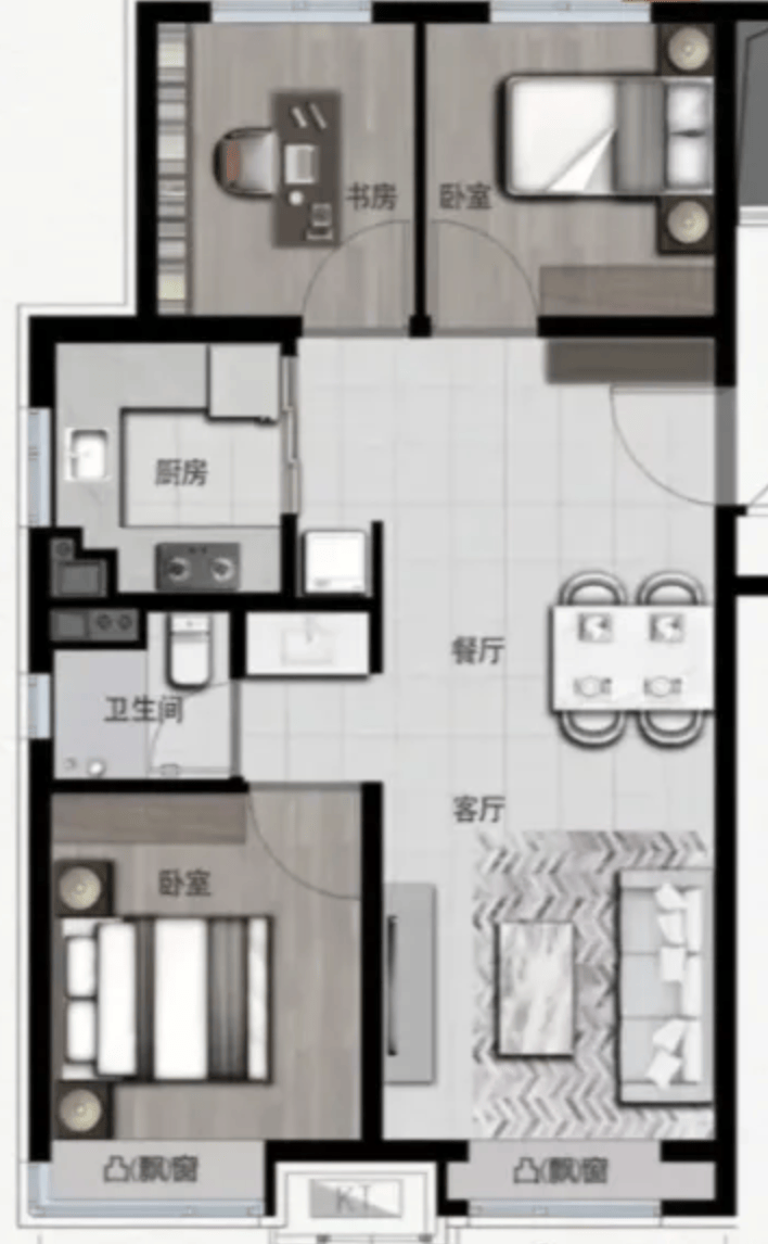 这个面积段户型市面上也有,不过嘉境里很规整,空间切割很利落,大大提高了空间利用率。期待具体的空间尺寸和得房率了。