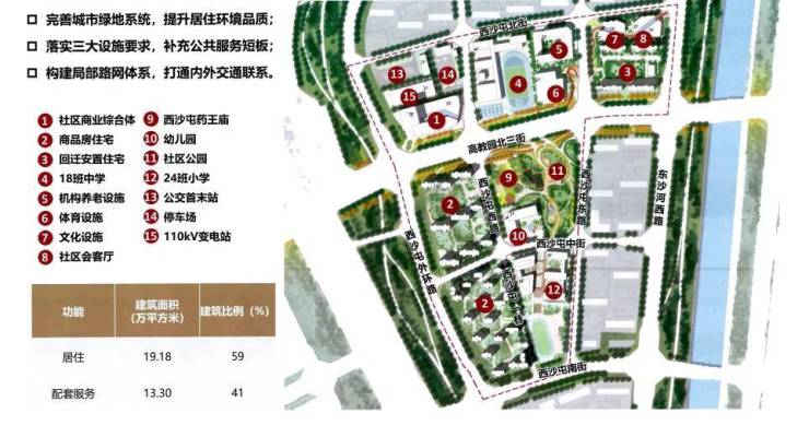 东侧10有建工配建的15班幼儿园,同时东南12规划了24班小学,北侧规划18班初中。北侧1规划了3.38万平的商业用地。