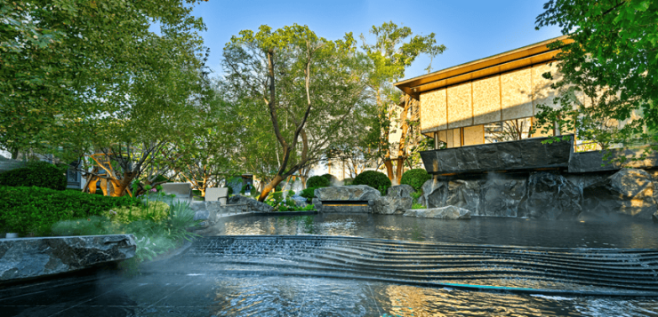 北京天誉,汲取宋代画家李成名作《晴峦萧寺图》的神妙,构造「三重境十二景」宋式园林,融合留园、泉池园、狮子林等南北园艺精技,用三重山水溯意东方神韵,借山、水、廊、石、桥等元素,集合丰富植被展现出别致立体的宋园风貌,十二景环环相扣、步移景异,层层叠叠间营造宋式风雅生活之诗。