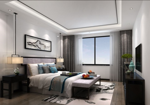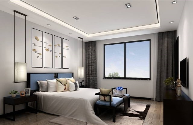 主卧布局合理,在满足了主人正常起居的需求外增加了卧室的美感,空间造型简约不繁琐,弥漫着高贵的气质,新中式的背景墙和吊灯别具一格,是整个空间灵魂所在。