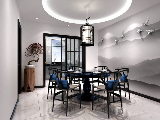 餐厅圆形吊顶寓意天圆地方。背景墙以水墨山水图做陪衬,营造出一种诗意自得的悠然心境,餐厅吊灯独特的造型更加使人置身其中,将人与空间的感情融为一体。
