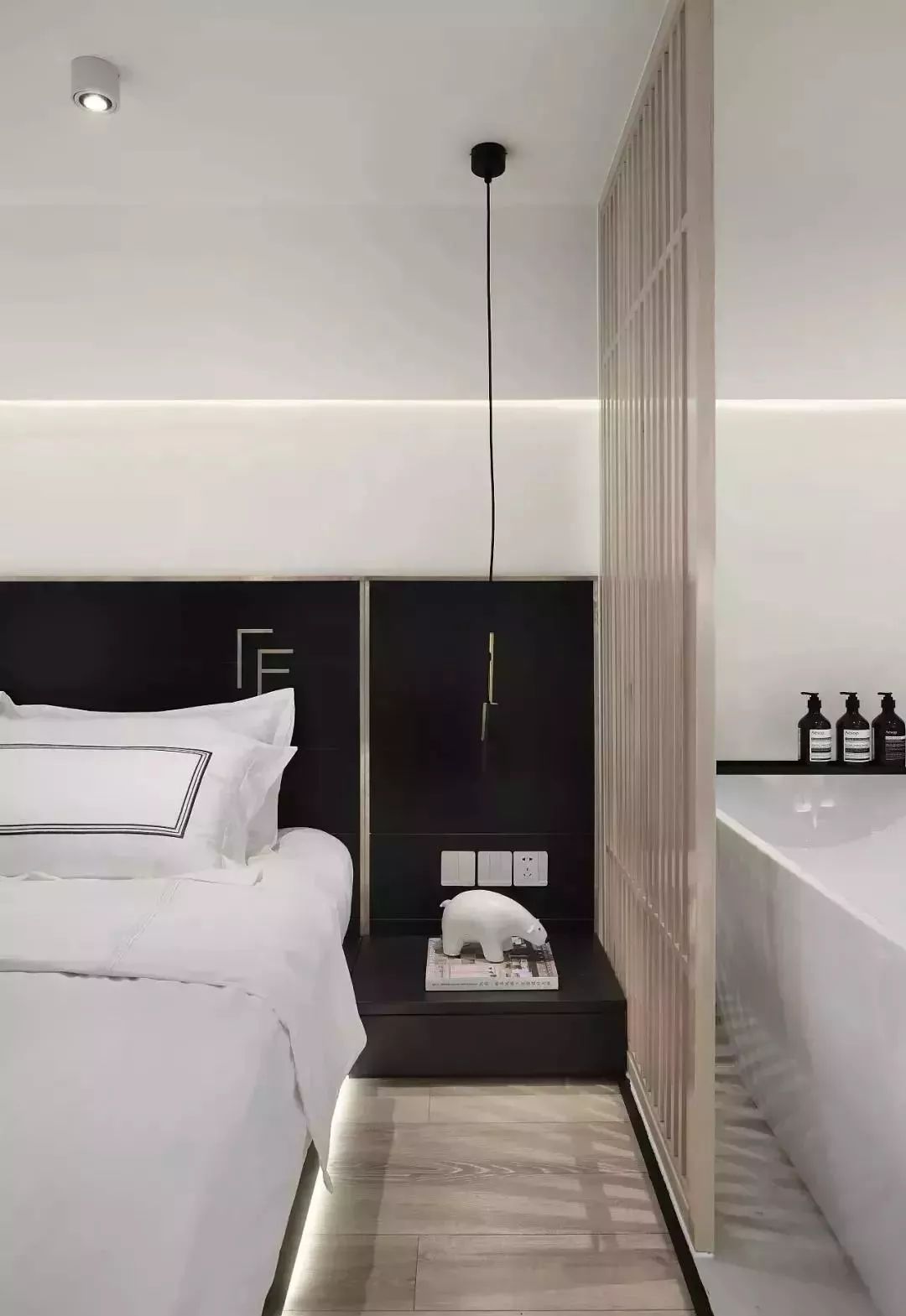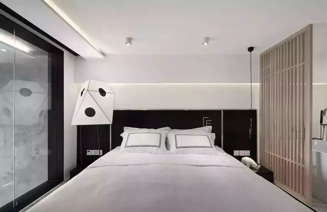 床铺也很简约,白色的床铺搭配黑色的大床。