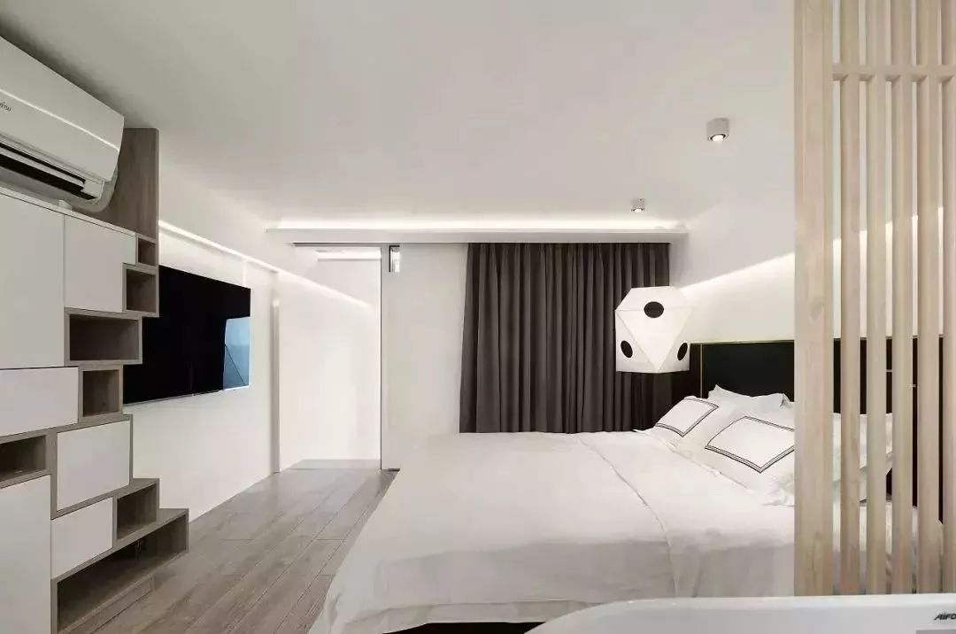 卧室地面铺贴了木地板,还在墙面上挂电视,电视旁边是不规则的收纳柜,很有创意。没有主灯的空间,以辅助照明为主,拉上窗帘就能营造一个舒适自然的休憩空间。