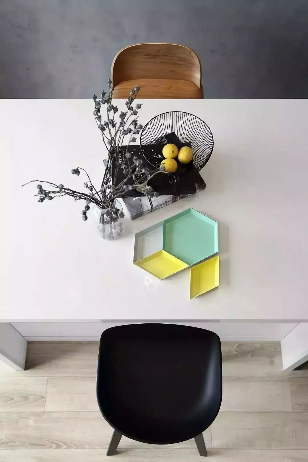 料理台上的彩色果盘,也让空间显得更加活力,点亮了简约空间的优雅感。