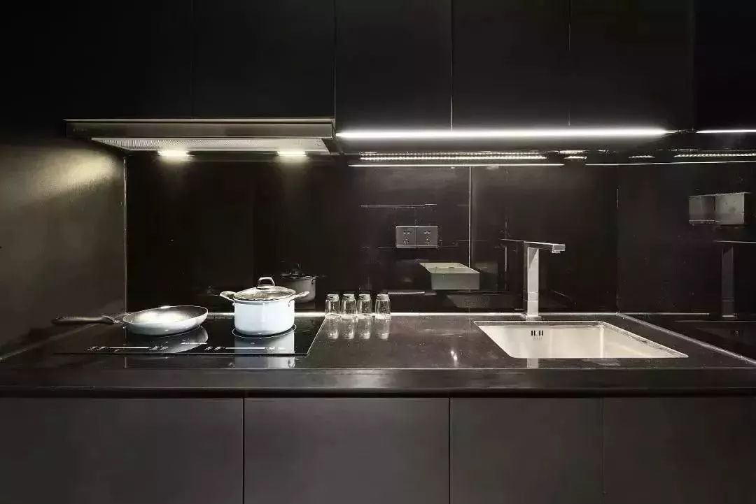 厨房是清一色的黑色,黑色的橱柜,还有黑色的吊柜,墙面也是黑色的大块的瓷砖,小小的厨房可以满足日常的需求。