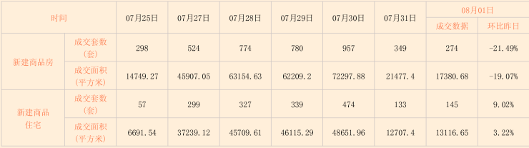 08月01日,北京市新建商品房成交274套,环比昨日下降21.49%,新建商品房成交面积17380.68㎡,环比昨日下降19.07% ;