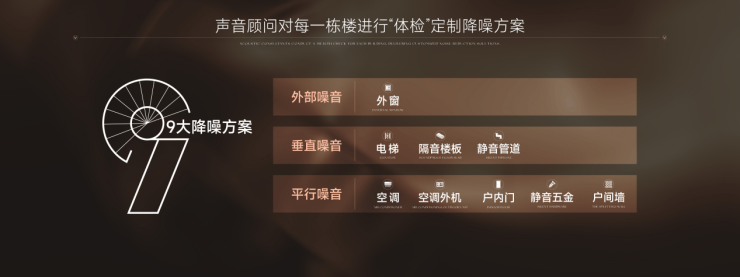 针对静音,通过专业声学顾问对每栋楼进行“体检”,分析噪音的外部来源、楼上楼下垂直影响、左邻右舍及户内平行影响,打造“9重静音系统”。