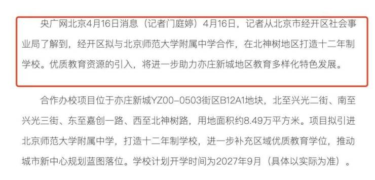 据央广网记者报道,经开区拟与北京师范大学附属中学合作,在北神树打造十二年制学校,计划开学时间为2027年9月,解决了附近一带的上学难题。