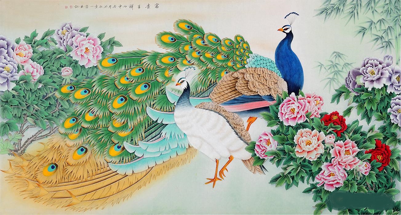 王一容工笔画孔雀牡丹图《富贵呈祥》